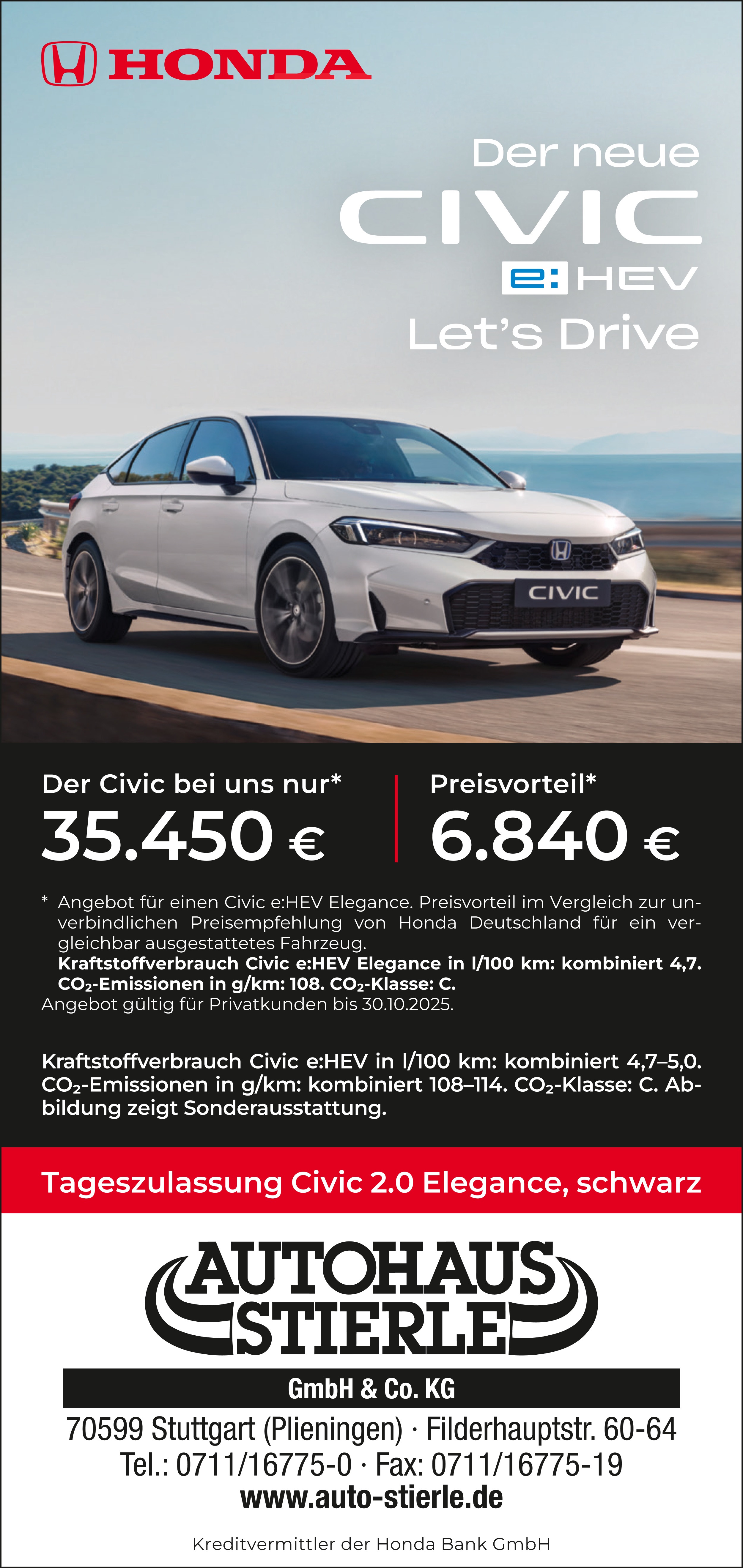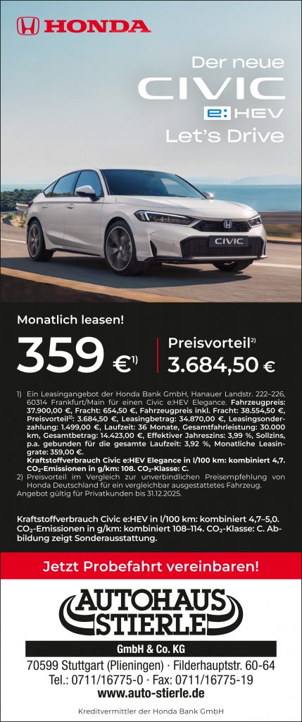 Stuttgart – Das Autohaus Stierle hat von Honda Deutschland für herausragende Leistungen im Verkauf die „Händlerauszeichnung für Kundenzufriedenheit 2021“ erhalten. Die Übergabe der Urkunde fand kürzlich in Stuttgart-Plieningen statt.